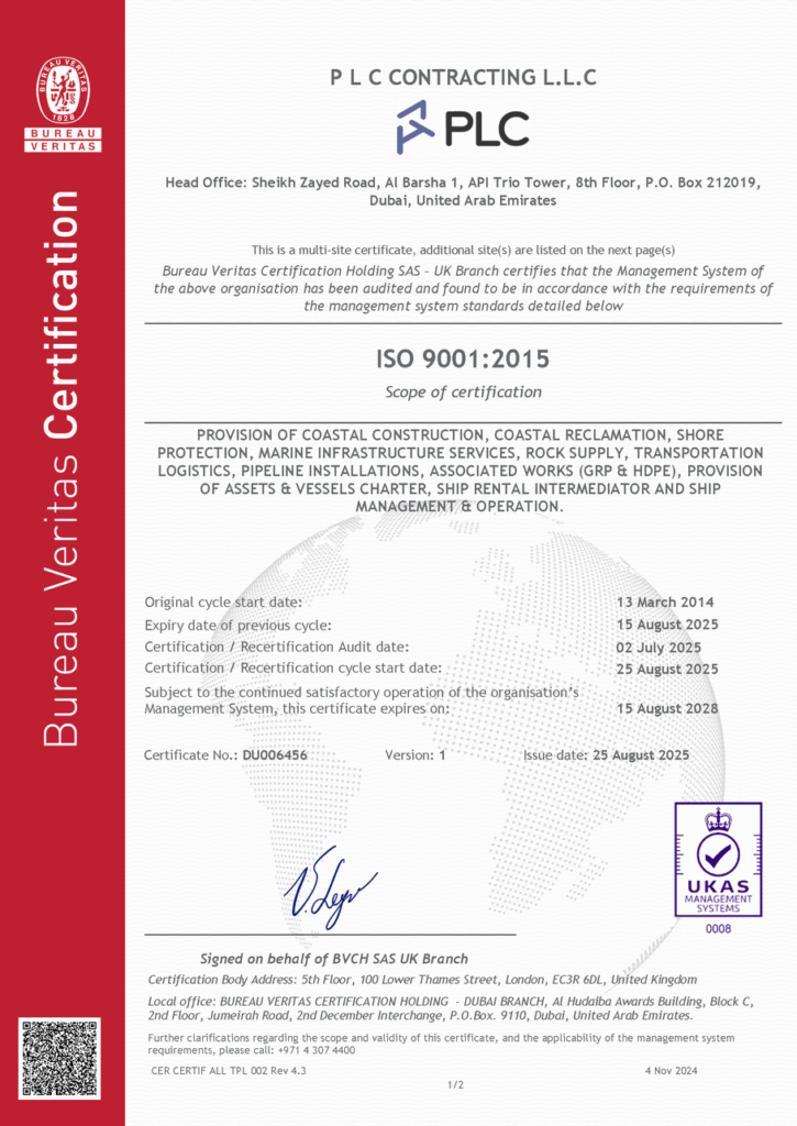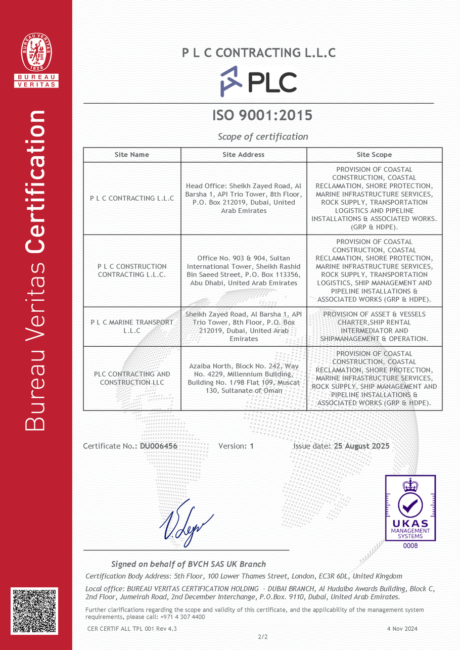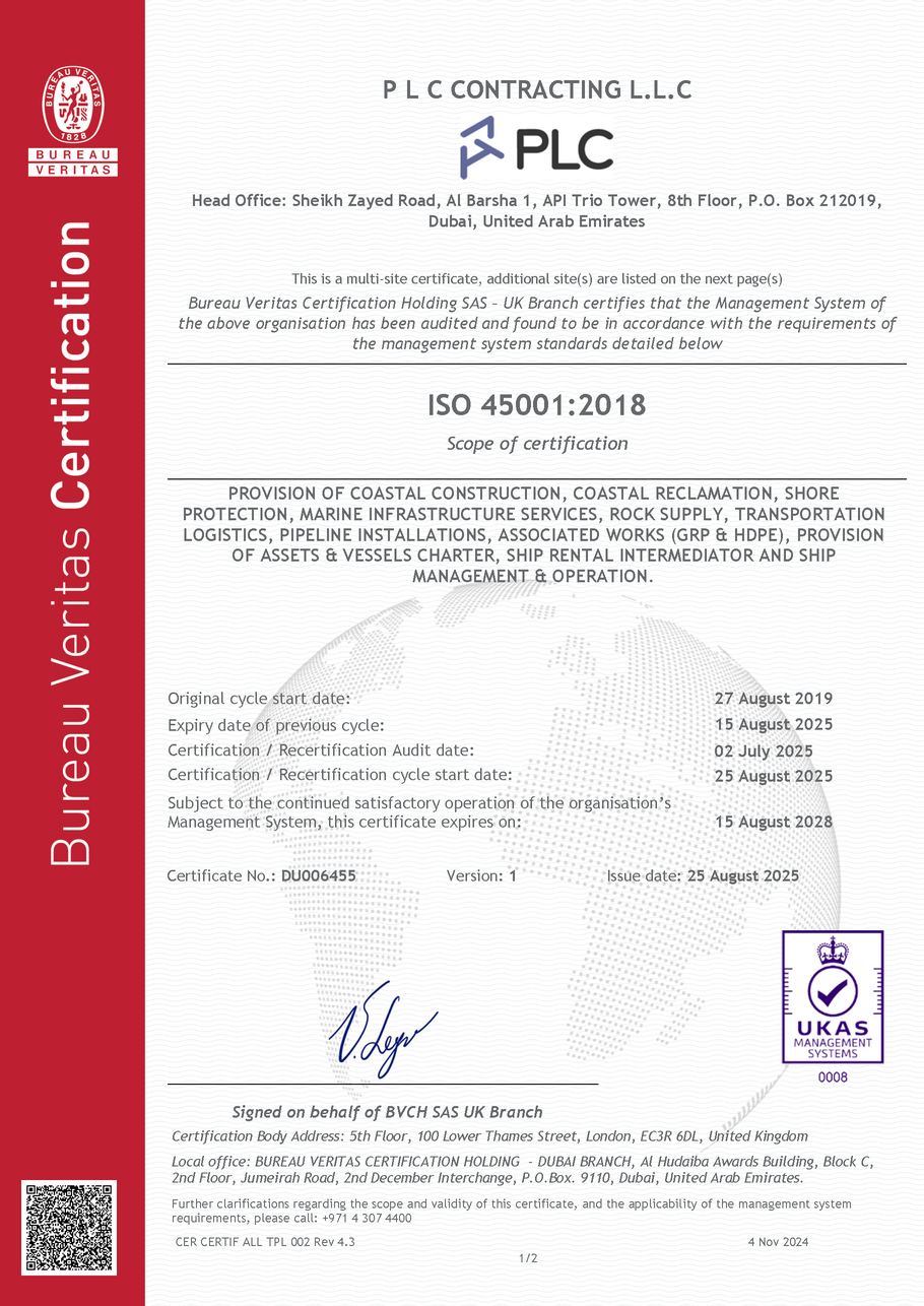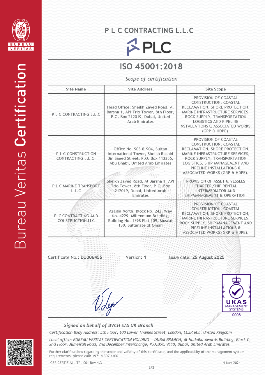 ISO Certifications PLC Group of Companies are certified to ISO 9001, ISO 14001 and ISO 45001 PLC Contracting and PLC Marine operates an integrated management system, all in compliance to theQuality Management System Standard – ISO 9001Environmental Management Standard – ISO 14001Occupational Health and Safety Management System Standard – ISO 45001 Quality, OH&S and Environmental Policies