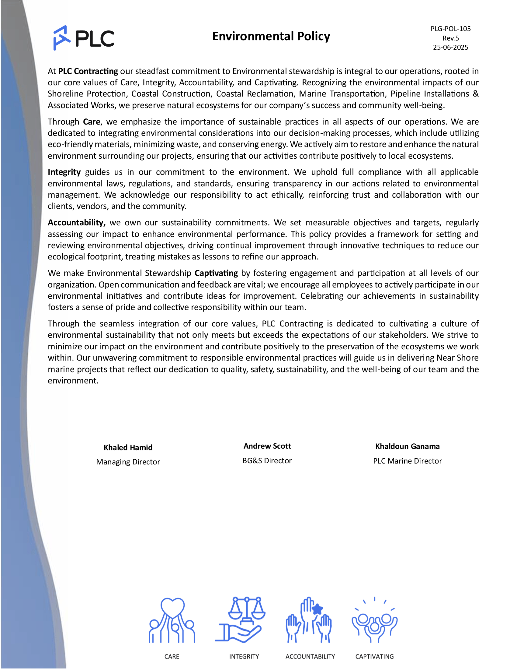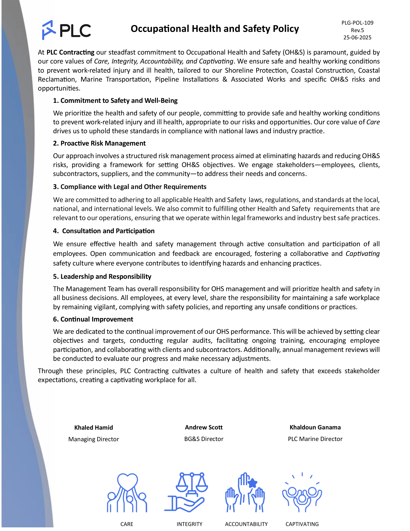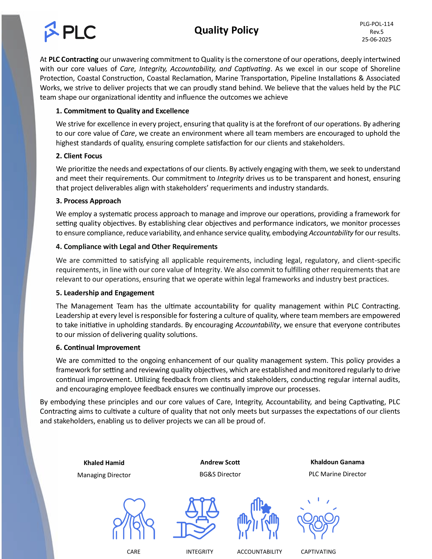 ISO Certifications PLC Group of Companies are certified to ISO 9001, ISO 14001 and ISO 45001 PLC Contracting and PLC Marine operates an integrated management system, all in compliance to theQuality Management System Standard – ISO 9001Environmental Management Standard – ISO 14001Occupational Health and Safety Management System Standard – ISO 45001 Quality, OH&S and Environmental Policies